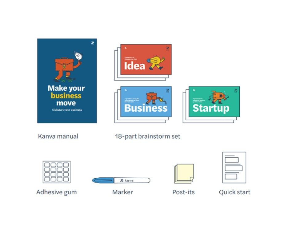 To make sure that your Kanva is plug-and-play, you will find everything you need from markers to post-it, sticky gum and a quickstart to get going.